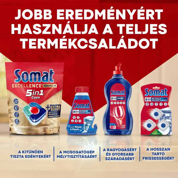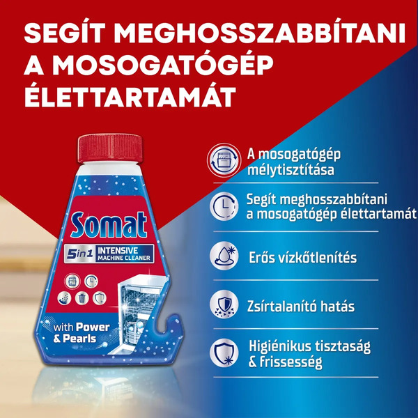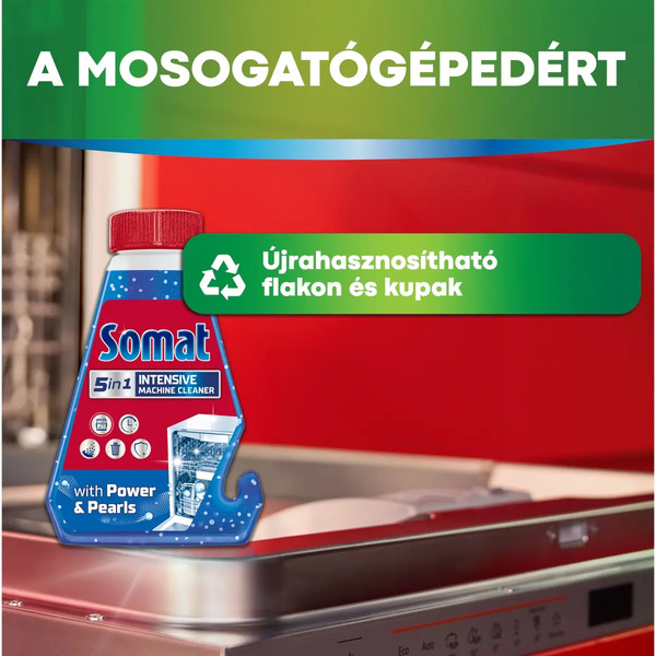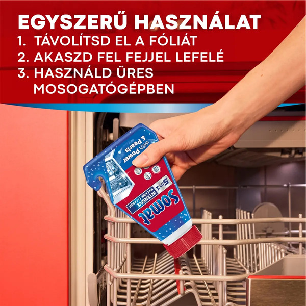 A Somat intenzív mosogatógép tisztító erőteljesen tisztítja a mosogatógép legnehezebben elérhető részeit: a szórókarokat, szűrőt, vízszivattyút és a csöveket. A formula higiénikus tisztaságot biztosít a makacs zsírlerakódással és vízkőmaradványokkal szembeni extra erős hatásának köszönhetően.